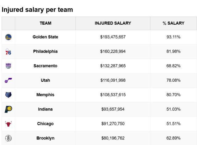 勇士伤员总薪水1.93亿联盟最惨!首发年薪不足千万
